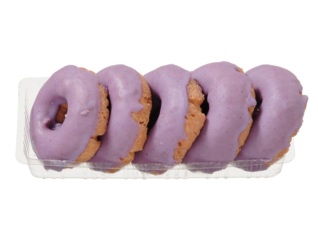 ストロベリー果汁と砂糖漬けしたクランベリーの果肉を練り込んだ生地にブルーベリーシュガーグレーズをかけた、ミニリングドーナツ5個入です。