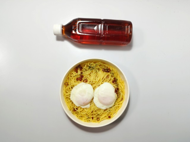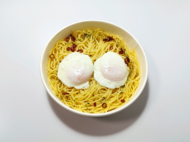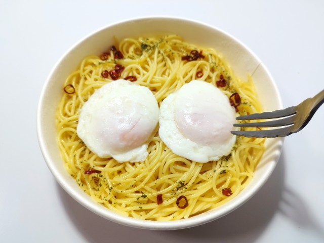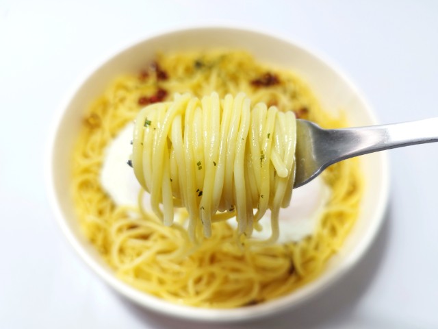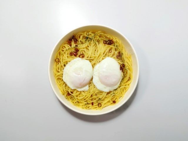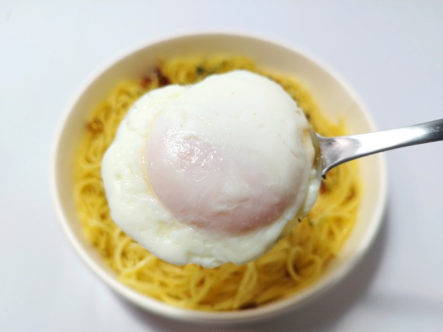 たまごのぺぺロンチーノです。個人的にぺぺたまは何となく見聞きした事はあったものの、たまぺぺは初めて聞いた言葉で、インパクトある見た目も気になって買ってみました。そんなたまぺぺですが、ペペロンチーノにんにくの風味唐辛子のピリッとした辛味で、やや薄味ながらも美味しいです。トッピングには半熟たまご2個のっていて、半熟たまごを崩して黄身パスタを絡める事で、また違った味わいを楽しめます。全体的にはにんにくの風味唐辛子の辛味はそこまでガッツリといった感じではありませんが、逆に半熟たまごを絡めた時に、にんにくが勝ってしまうといった事もないので、かなり食べやすいペペロンチーノになっていると思います。内容量は1食分にちょうどよく、お腹も満たされます。ぜひたまぺぺを食べてみて下さい。