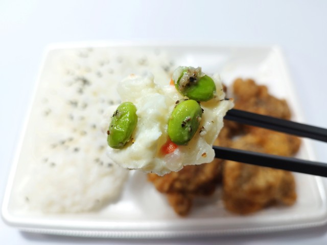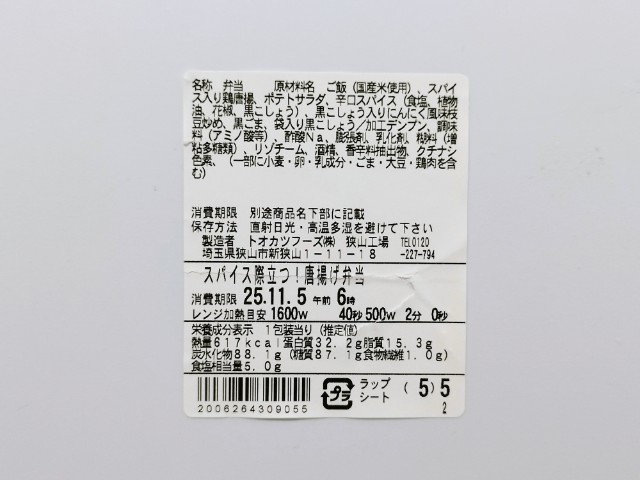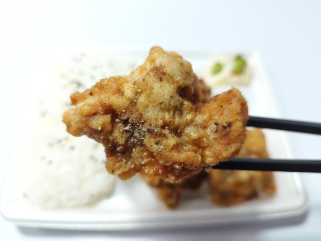 料理研究家リュウジさんが監修したから揚げ弁当です。ファミリーマートでは11月4日から昨年に続き、今年も「リュウジの至高のレシピ」フェアを開催していて、今回の商品もその対象商品の一つになっています。そんなから揚げ弁当ですが、から揚げはスパイスの風味と鶏の旨味があって、ご飯が進む一品になっています。特にから揚げはナツメグやクミン、オールスパイスが使われていて、さらに花椒やブラックペッパーなどがまぶされているといった徹底ぶりで、から揚げを楽しむというよりもスパイスを楽しむ為のから揚げといった感じになっています。また、今回は撮影の為に先にかけてしまいましたが、別添の黒コショウは元々のスパイスの味わいを楽しんだ後に、味変として少しずつかけるのがベストだと思います。内容量は1食分にちょうどよく、お腹も満たされます。ぜひスパイス際立つ!唐揚げ弁当を食べてみて下さい。