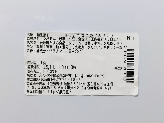 熱量:260kcal、たんぱく質:4.9g、脂質:7.0g、炭水化物:46.6g(糖質:42.2g、食物繊維:4.4g)、食塩相当量:0.11g