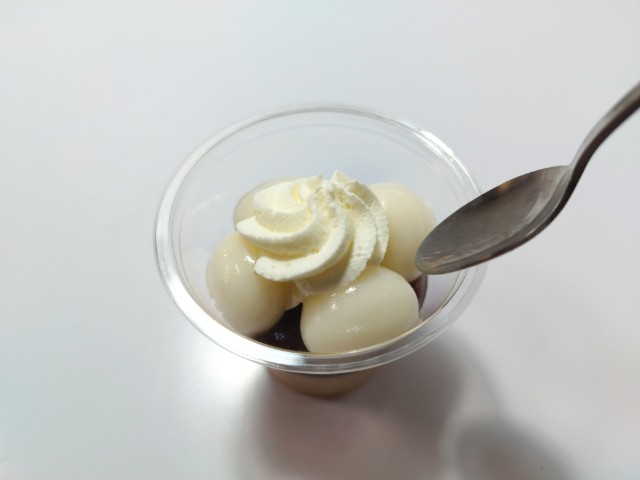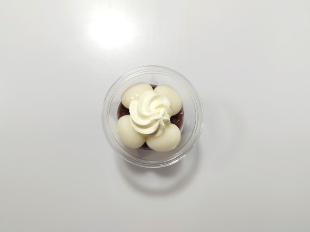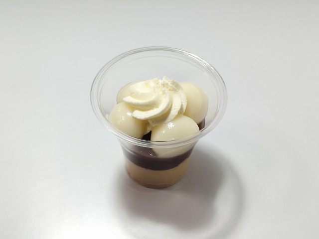 白玉やホイップリーム、きなこムースなどを使ったカップスイーツです。シンプルながらその見た目に惹かれて買ってみました。そんな白玉ときなこのぜんざいですが、上から白玉、ホイップクリーム、粒あん、きなこムースになっていて、白玉はもちもちとした食感とほのかな甘味、ホイップクリームはふんわりとした食感とミルクの風味で、安定の美味しさです。下の粒あんはなめらかな食感と小豆の味わい、きなこムースはプルンとした食感ときなこの香ばしさで、相性抜群の組み合わせになっています。全体的に甘味はあるものの、スッキリとした甘味で食べやすいカップスイーツだと思います。内容量は一人分にちょうどよく、おやつや食後のデザートにオススメです。ぜひ白玉ときなこのぜんざいを食べてみて下さい。