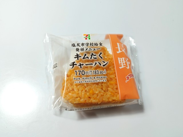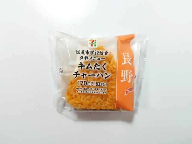 キムたくチャーハンおむすびです。セブンイレブンでは11月4日からご当地食材&なじみのある地域メニューを各地区で発売する地域フェア「全国11エリアで開催!うまいもの決定戦」を開催していて、各地域ならではのご当地代表商品が発売されています。また、今回は「地元以外の人気商品も試してみたい」との声に応えて、各地域から選抜した全国選抜商品も発売しているそうです。ちなみに今回の商品は全国選抜商品の一つになっています。なお、キムたくごはんはセブンイレブン公式の商品説明にも書かれているように長野県塩尻市の学校給食発祥メニューとの事で、全国的にもかなり有名だと思いますが、今回はそのキムたくごはんをアレンジしたおむすびになっています。そんなキムたくチャーハンおむすびですが、キムチの味わいとたくあんの食感があって、食べ出すと止まらなくなる美味しさです。また、パラパラ食感というよりもしっとり食感に近いチャーハンになっているので、おむすびとしてはかなり食べやすいと思います。大きさは普通のおむすびサイズで、小腹が空いた時や主食にあと一品追加したい時にピッタリです。ぜひキムたくチャーハンおむすびを食べてみて下さい。