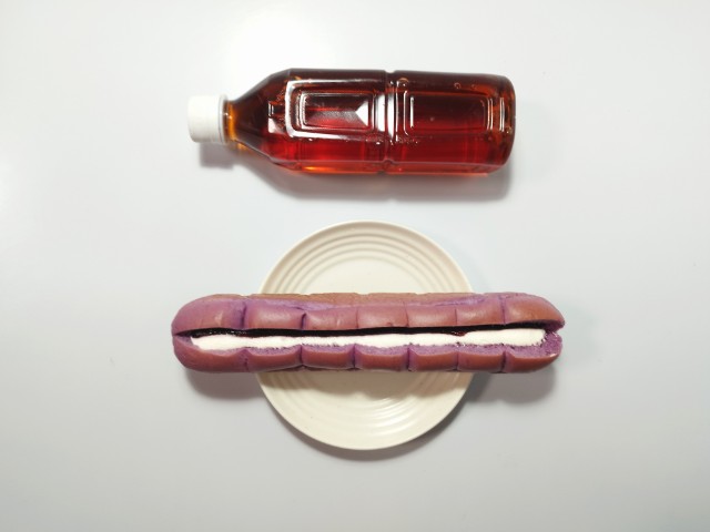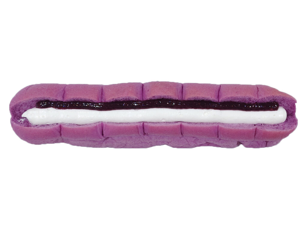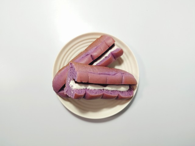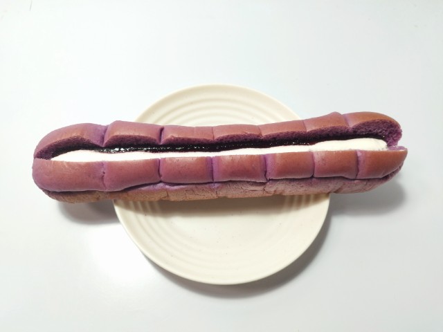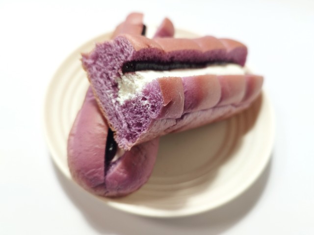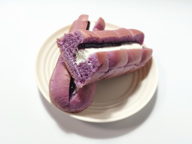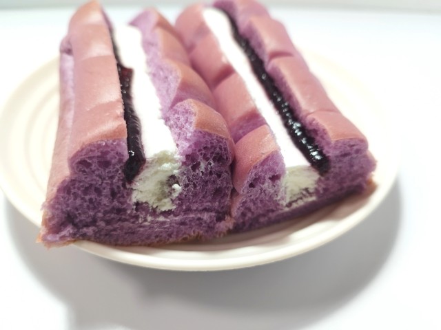 ブルーベリーをイメージした紫色のちぎりパンに、茨城県産ブルーベリーで作られたジャムとホイップをサンドした菓子パンです。