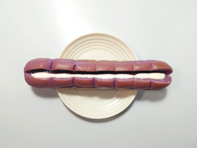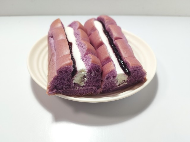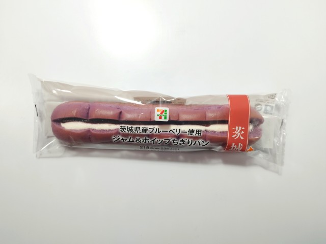 茨城県産ブルーベリージャムとホイップクリームを使ったちぎりパンです。セブンイレブンでは11月4日からご当地食材&なじみのある地域メニューを各地区で発売する地域フェア「全国11エリアで開催!うまいもの決定戦」を開催していて、各地域ならではのご当地代表商品が発売されています。また、今回は「地元以外の人気商品も試してみたい」との声に応えて、各地域から選抜した全国選抜商品も発売しているそうです。ちなみに今回の商品はご当地代表商品の一つになっています。そんなブルーベリージャム&ホイップちぎりパンですが、生地はふんわりとした食感と歯切れの良さで、どんどんと食べ進められます。また、生地は見た目と違ってブルーベリーの風味などは一切なく、小麦の風味を感じるシンプルな味わいになっています。生地の間に挟まっているブルーベリージャムはほのかな酸味となめらかな食感、ホイップクリームはやさしい甘味とふんわりとした食感で、生地とのバランスも良いです。ポイントは商品名の通り、ちぎりながら食べるパンなので、ちぎりやすいようにパン生地には溝が出来ている部分だと思います。横に長いパンですが、縦幅はないので、一人でも普通に食べ切れます。ぜひブルーベリージャム&ホイップちぎりパンを食べてみて下さい。