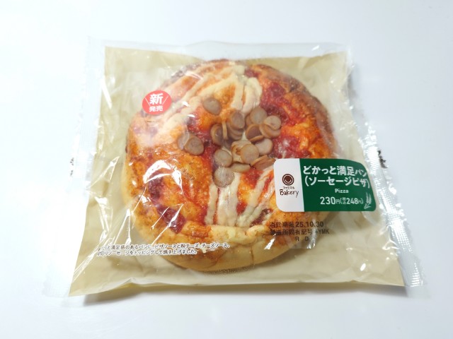ピザソースチーズソース輪切りソーセージなどがのった惣菜パンです。以前にどかっと満足パン(ベーコンピザ)(2025年9月16日発売)がありましたが、今回はフランスパン生地ではなく、普通のパン生地になっていて、サイズも今回の方がやや大きいようです。そんなどかっと満足パンですが、生地ふんわりとした食感歯切れの良さで、食べ応え抜群です。トッピングにはピザソース粉チーズチーズソース輪切りソーセージがのっていて、ピザソースの旨味チーズの風味ソーセージの味わいを楽しむ事が出来ます。大きさは普通の惣菜パンの1.5倍くらいはあるので、がっつりと食べたい方にはピッタリです。ぜひどかっと満足パンを食べてみて下さい。