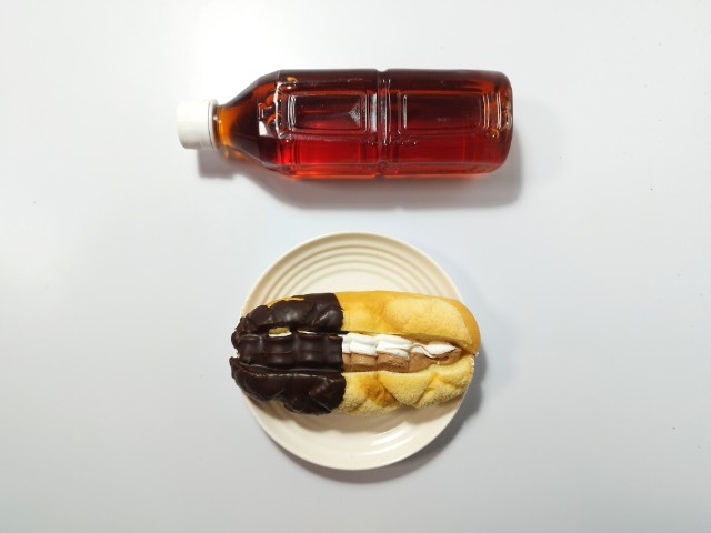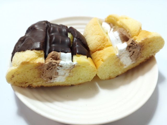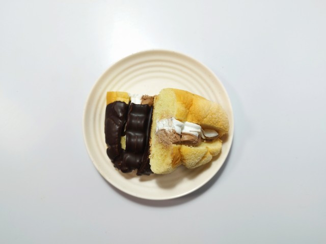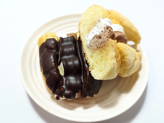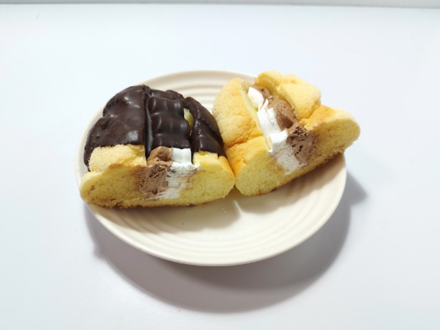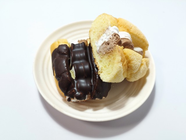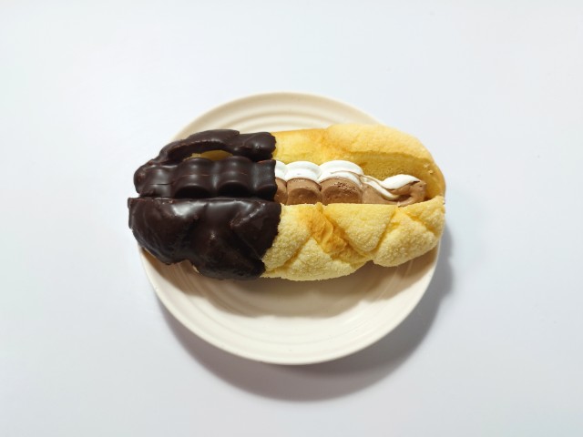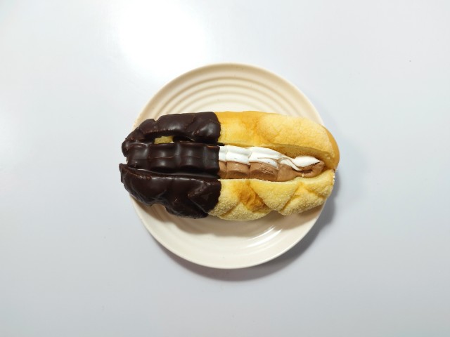 ロールパン形状のメロンパンに、ミルクホイップとチョコホイップをサンドし、チョコをコーティングしました。