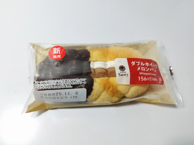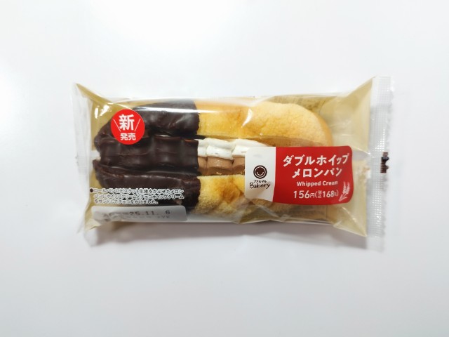 ミルクホイップとチョコホイップが挟まったロールパン形状のメロンパンです。これまでコンスタントに発売されているホイップメロンパン(2024年11月5日発売)の進化版といった感じの商品で、今後はこちらがメインになるのかもしれません。そんなダブルホイップメロンパンですが、ロールパン形状の表面はビス生地が使われていて、しっとりとした食感と砂糖のシャリシャリ食感を楽しめます。中のパン生地はふっくらとした食感と歯切れの良さで、ビス生地とのバランスも良いです。ミルクホイップはミルクの風味、チョコホイップはコーヒーの風味で、どちらもなめらかな食感でくちどけも良いです。半分だけかかったチョココーティングが味のアクセントといった感じでチョコの甘味を楽しむ事が出来ます。大きさは普通の菓子パンサイズで、おやつや小腹が空いた時にピッタリです。ぜひホイップメロンパンを食べてみて下さい。