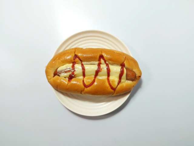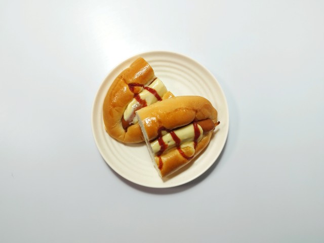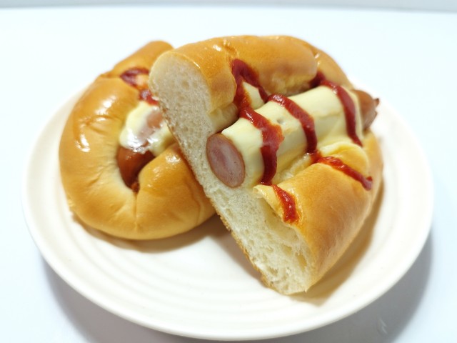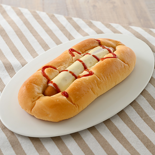 ジューシーな粗挽きポークソーセージに、ケチャップとからしマヨソースをトッピングして焼き上げた惣菜パンです。