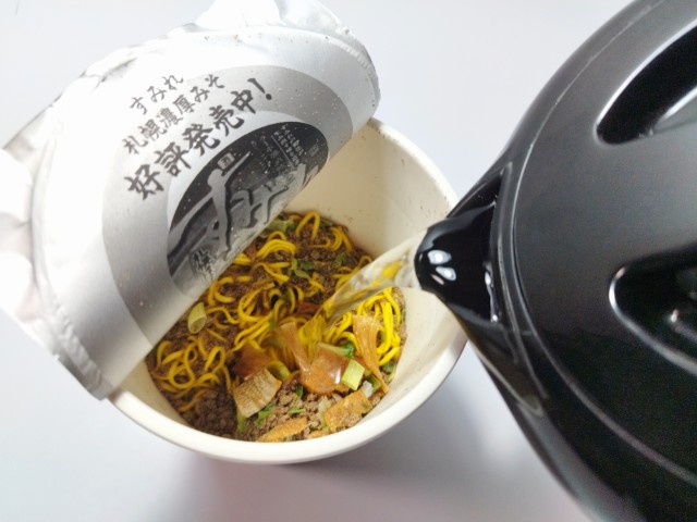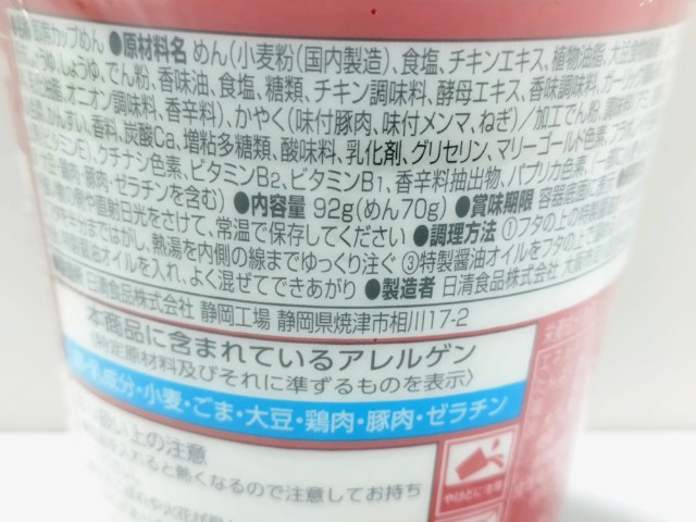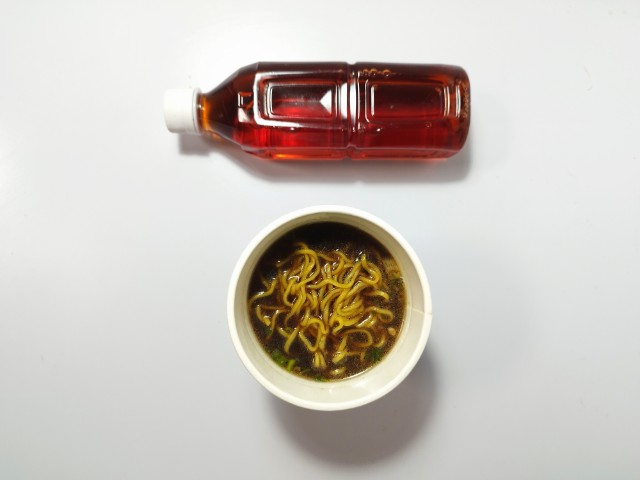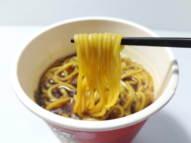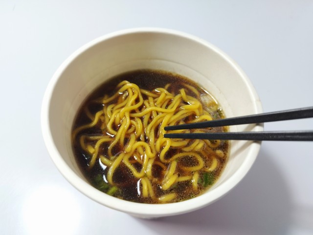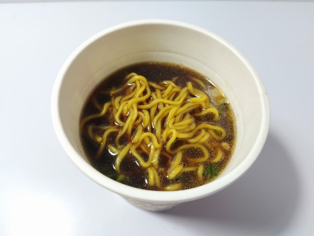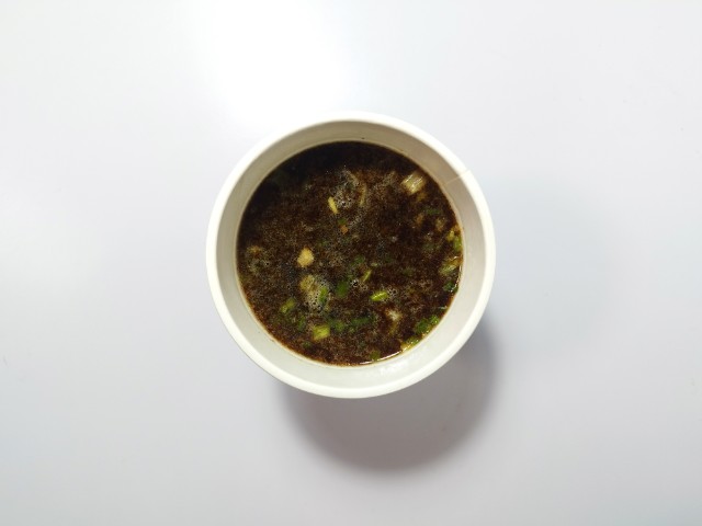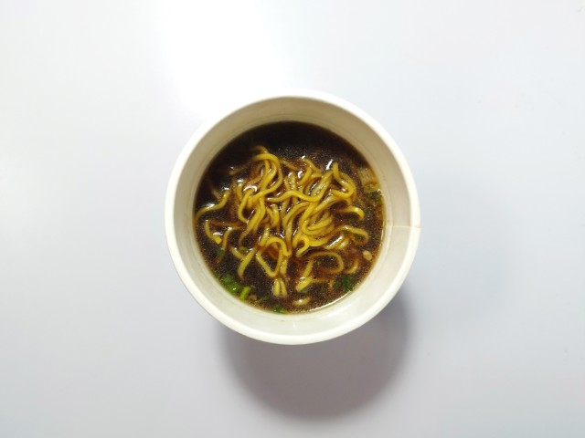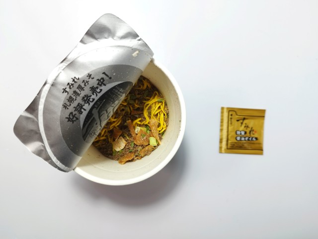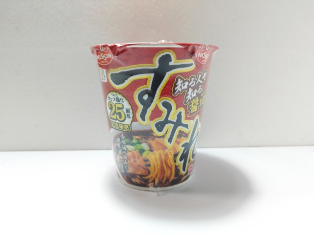 すみれカップ麺発売の25周年を記念して作られた醤油ラーメンです。すみれというと札幌味噌ラーメンのイメージですが、今回は第二の看板である醤油をカップ麺で再現したとの事で、さっそく買ってみました。そんな醤油ラーメンですが、真っ黒な見た目のスープは豚の旨味と醤油の味わい、にんにくの風味で、見た目ほど味は濃くありません。麺はノンフライ麺が使われていて、つるりとした食感と小麦の風味で、スープとの絡みも良いです。具材には味付豚肉やメンマ、ねぎが入っていて、それぞれの味や食感を楽しめます。正直、札幌味噌ラーメンの美味しさが際立っているので、今回の醤油ラーメンは個人的にはちょっと違った印象ではありましたが、この味が好きな方もいると思います。内容量は普通のカップ麺サイズで、小腹が空いた時やおにぎりやパンと合わせて1食分にするのにもオススメです。ぜひ醤油ラーメンを食べてみて下さい。