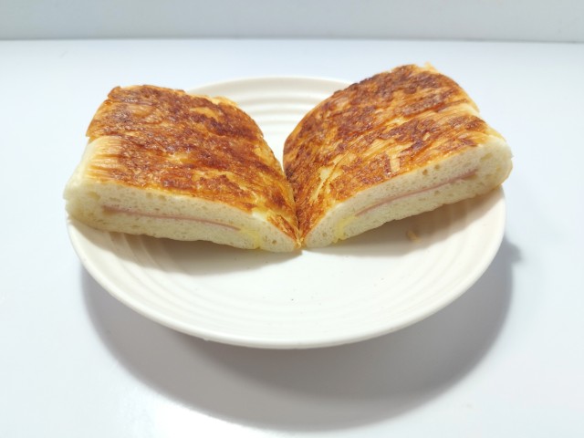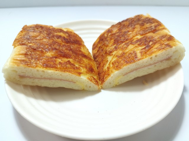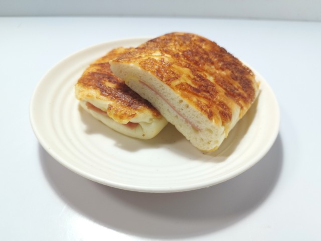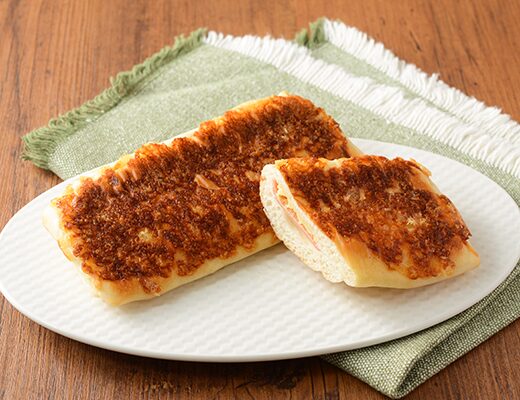 ハムとチーズソースを使ったパニーニです。もっちりとしたパニーニ てりやきチキンたまご(2025年10月21日発売)と同時発売された商品で、ハムとチーズソースの組み合わせに惹かれて買ってみました。そんなもっちりとしたパニーニですが、生地はもちもちとした食感と小麦の風味で、ハマってしまう美味しさです。中にはハムとチーズソースが入っていて、ハムの塩味とチーズソースのなめらかな味わいで、相性抜群の組み合わせになっています。シンプルな美味しさながら、パニーニの食感もあって、最後のひと口まで美味しく食べられます。大きさは普通の惣菜パンくらいで、小腹が空いた時や主食にあと一品追加したい時にピッタリです。ぜひハムチーズのもっちりとしたパニーニを食べてみて下さい。