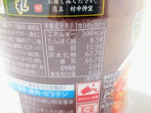 熱量:398kcal、たんぱく質:8.3g、脂質:10.9g、炭水化物:67.7g(糖質:65.7g、食物繊維:2.0g)、食塩相当量:4g