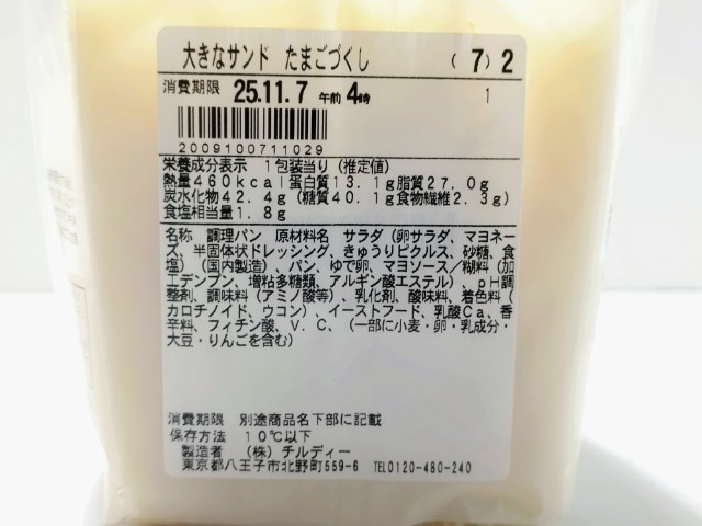 たまごサラダを使った大きなサンドイッチです。パンの厚みがあるボリューム満点のサンドイッチで、その見た目に惹かれて買ってしました。そんな大きなサンドイッチですが、厚みのある生地はしっとりとした食感と歯切れの良さで、安定の美味しさです。タルタルたまごサラダはたまごの甘味とタルタルの味わい、ゆでたまごは黄身のコク、白身のプルンとした食感があって、パンとの相性抜群です。普通のサンドイッチに比べてサイズがあるので、お腹も軽く満たされると思います。ぜひたまごづくしの大きなサンドイッチを食べてみて下さい。