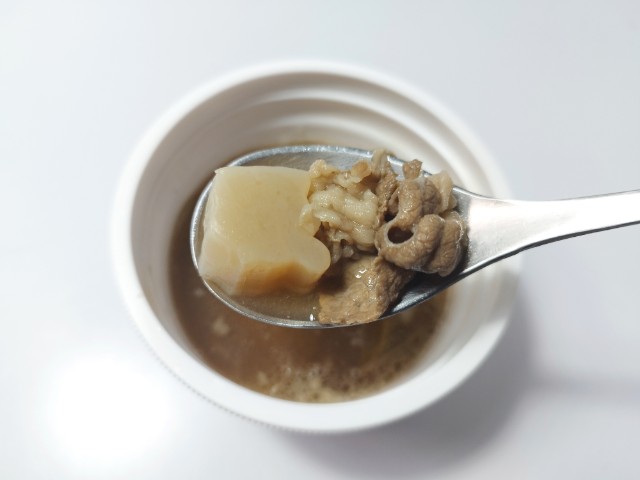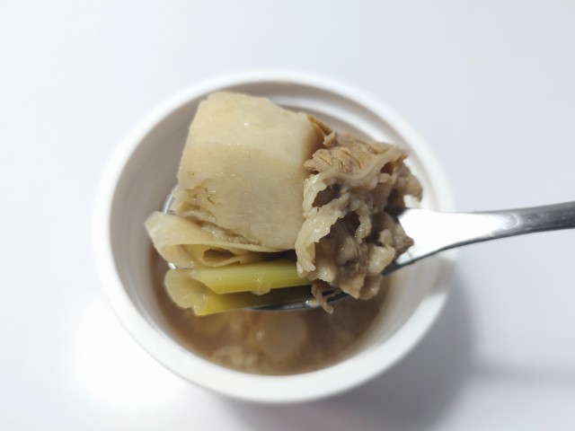 里芋牛肉ごぼうなどが入った芋煮です。セブンイレブンでは11月4日から全国9種類のご当地スープを味わえる「日本横断!ご当地スープ巡り」を開催していて、今回の商品もその対象商品の一つとなっています。そんな芋煮ですが、牛の旨味醤油の風味やさしい甘味があって、間違いのない美味しさです。具材には里芋を始め、牛肉ごぼうねぎこんにゃくなどが入っていて、それぞれの味や食感を楽しめます。シンプルながらハズレのない美味しいスープといった感じで、食材の多さもあって、満足度はかなり高いと思います。内容量は一人分にちょうどよく、小腹が空いた時主食にあと一品追加したい時にピッタリです。ぜひ芋煮を食べてみて下さい。