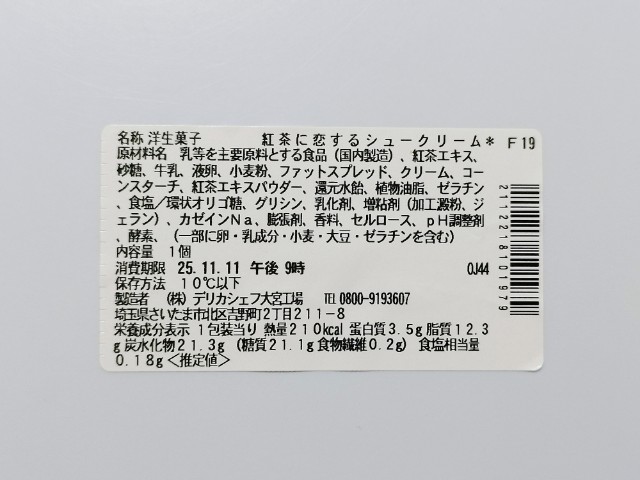 紅茶ゼリー入りのミルクティクリームが入ったシュークリームです。見つけた瞬間に手に取ってしまった商品で、個人的には楽しみにしていた新商品の一つでもあります。そんなシュークリームですが、シュー生地はふわっとした食感と歯切れの良さで、安定の美味しさです。中に使われているミルクティクリームはなめらかな食感と紅茶の風味、ミルクのやさしい味わいで、スッキリとした後味になっています。ポイントはミルクティクリームに入っている紅茶ゼリーで、プルプルとした食感と紅茶の味わいがあって、食感のアクセントになっています。大きさは普通のシュークリームサイズで、おやつや食後のデザートにピッタリです。ぜひ紅茶に恋するシュークリームを食べてみて下さい。