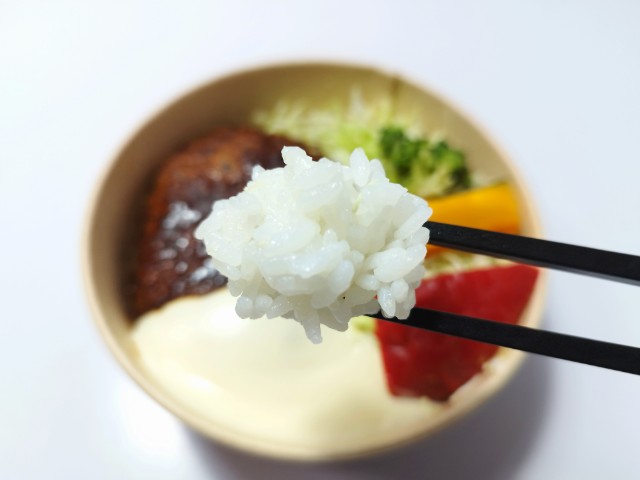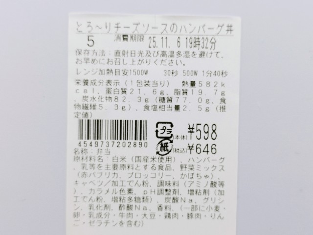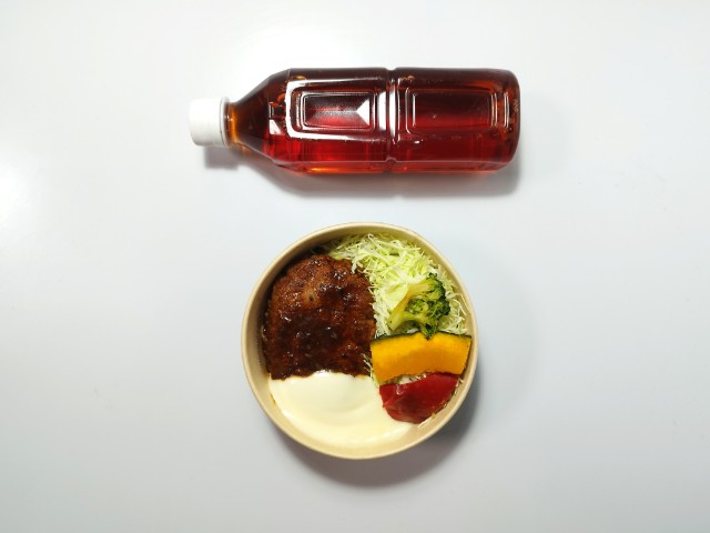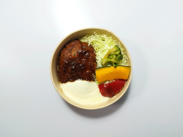 チーズソースがかかったハンバーグ丼です。ローソンでは11月4日から「ハッピーチーズフェア」を開催していて、今回の商品もその対象商品の一つになっています。そんなとろ〜りチーズソースのハンバーグ丼ですが、厚みのあるハンバーグは肉の旨味とジューシーな味わい、デミグラスソースのコクで、ご飯が進む一品になっています。やはりポイントはなめらかな味わいのチーズソースで、ハンバーグに合わせる事で美味しさがより引き立ちます。他にも赤パプリカやかぼちゃ、ブロッコリー、千切りキャベツものっているので、最後のひと口まで飽きることなく食べられます。内容量は1食分にちょうどよく、お腹も満たされます。ぜひとろ〜りチーズソースのハンバーグ丼を食べてみて下さい。