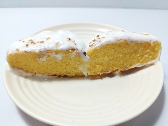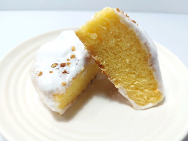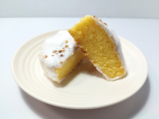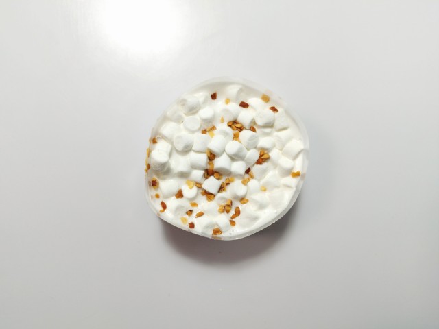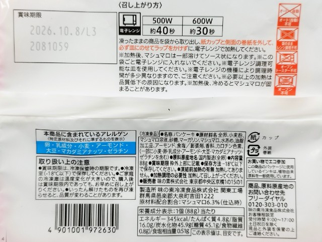 マシュマロパンケーキです。見つけた瞬間に手に取ってしまった商品で、個人的には楽しみにしていた新商品の一つでもあります。そんなマシュマロパンケーキですが、冷凍食品として発売されている商品で、袋を開けた瞬間から甘い香りがしてきます。実際に食べてみると、パンケーキはしっとりした食感とたまごの風味、ジュワっと溢れる味わいがあって、これだけでも美味しく食べられます。マシュマロはとろける食感としっかりとした甘味で、パンケーキとの相性抜群です。トッピングされたクラッシュアーモンドが食感のアクセントになっていて、最後のひと口まで飽きることなく食べられます。また、1個あたり345kcalとヘビーな食べ物になっているので、美味しいながらもかなりの背徳感があります。大きさは手のひらサイズよりやや大きいくらいで、おやつや甘味が欲しい時にピッタリです。ぜひマシュマロパンケーキを食べてみて下さい。