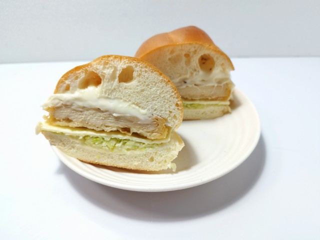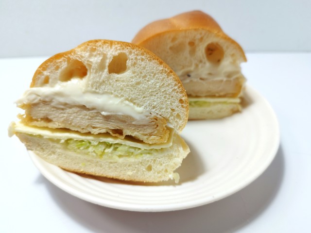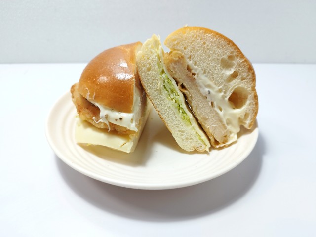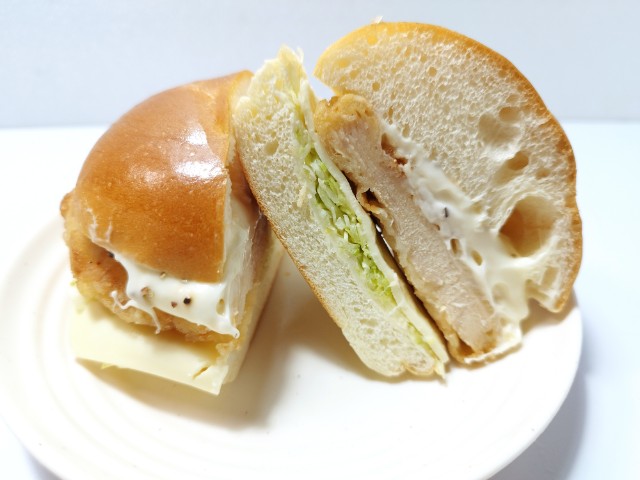 鶏竜田揚げとチーズソースの他に、キャベツやスライスチーズが挟まっています。
