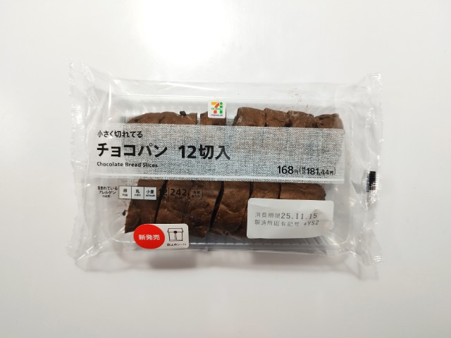 小さくカットされたチョコパンです。少し前に7P 小さく切れてる ガーリックフランス12(2025年11月4日発売)がありましたが、今回はフランスパンを使ったチョコ風味のパンになっています。そんなチョコパンですが、生地はひきのある食感とチョコの風味で、食べ応え抜群です。特にチョコのジュワっと溢れてくる味わいがポイントで、よく噛まないといけないフランスパンならではの特長だと思います。また、生地にはチョコチップが混ぜ込まれていて、カリッとはいかないまでも、甘味と食感のアクセントになっています。12切入で、1切れの大きさはひと口サイスくらいなので、一人でも食べ切れなくはないですが、シェアするのにちょうど良いと思います。ぜひチョコパンを食べてみて下さい。