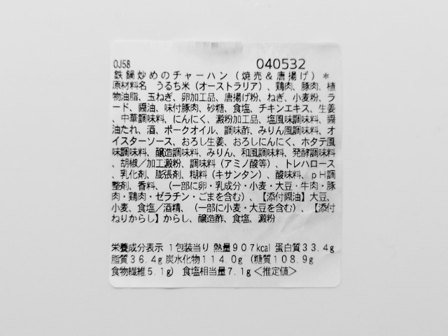 熱量:907kcal、たんぱく質:33.4g、脂質:36.4g、炭水化物:114.0g(糖質:108.9g、食物繊維:5.1g)、食塩相当量:7.1g