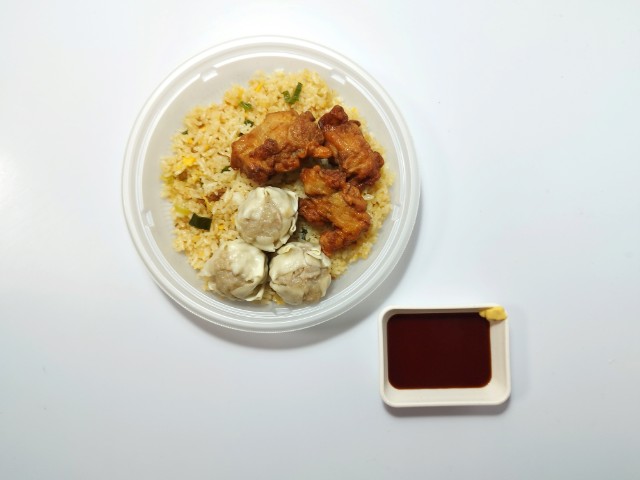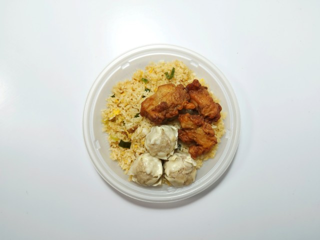 香ばしく炒めたチャーハンに焼売と唐揚げを合わせた、食欲をそそるお弁当です。