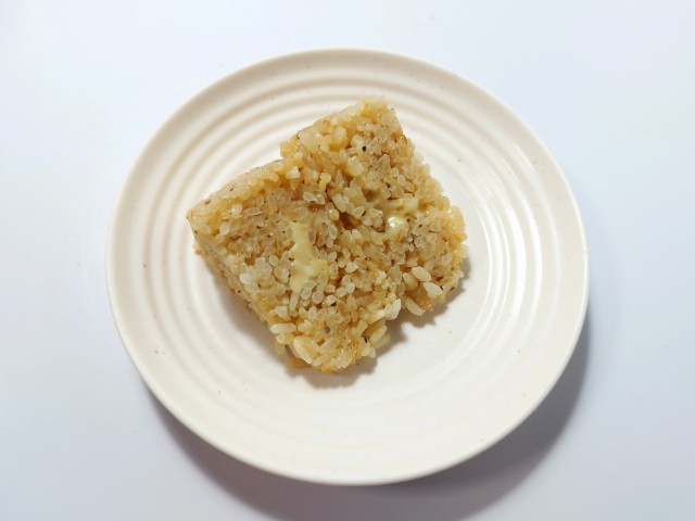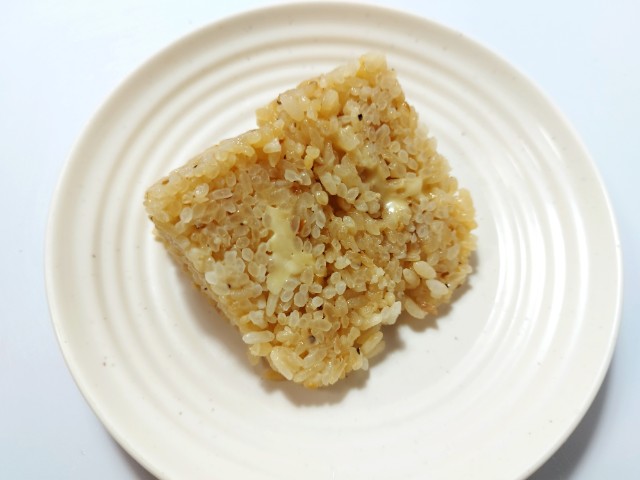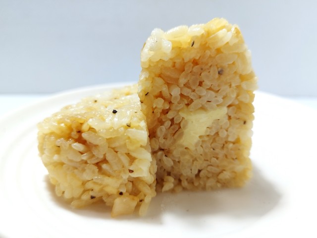 スモークチーズ香るベーコンバターおにぎりです。ローソンでは11月4日から「ハッピーチーズフェア」を開催していて、今回の商品もその対象商品の一つになっています。そんなおにぎりですが、ご飯はスモークチーズや黒胡椒、ベーコンを混ぜ込んだバター醤油ご飯になっていて、スモークチーズの香りや黒胡椒の辛味、バター醤油の風味を楽しむ事が出来ます。中具のモザレラチーズとチーズソースは、チーズの塩味となめらかな味わいがあって、ご飯ともよく合います。また、パッケージに書かれている温めておいしいの言葉通り、温める事でバター醤油やチーズの風味がアップするので、余裕があれば温めて食べる事をオススメします。大きさは普通のおにぎりサイズで、小腹が空いた時や主食にあと一品追加したい時にピッタリです。ぜひスモークチーズ香るベーコンバターおにぎりを食べてみて下さい。