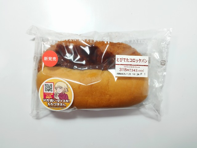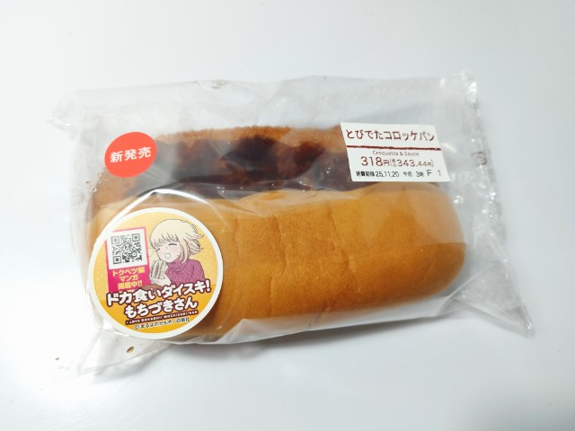 特大コロッケを挟んだ惣菜パンです。セブンイレブンでは11月18日から「ドカ食いダイスキ! もちづきさん」コラボ第2弾を開催していて、今回の商品もその対象商品の一つとなっています。そんなとびでたコロッケパンですが、生地はふんわりとした食感と歯切れの良さで、安定の美味しさです。特大コロッケの衣はサクッとした食感とソースの甘味、中のじゃがいもはホクホクとした食感で、食べ応え抜群です。大きさは普通のコロッケパン2個分くらいなので、ガッツリ食べたい方にはピッタリだと思います。ぜひとびでたコロッケパンを食べてみて下さい。