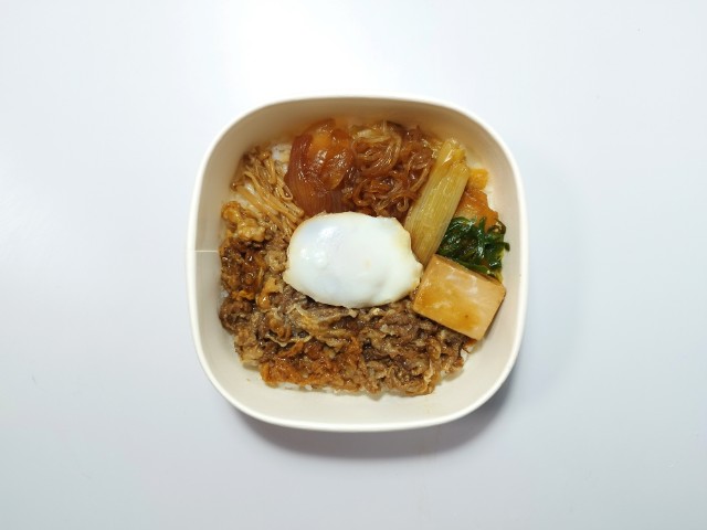 すき焼き丼です。セブンイレブンでは昨年の「セブンイレブン×ちいかわ あったまるね、きもち」キャンペーン(2024年12月3日~25日)に続き、今年も「ちいかわと冬をたのしんじゃお!」キャンペーンを12月2日より開催していて、今回の商品もその対象商品の一つとなっています。そんなすき焼き丼ですが、割り下で煮込んだ牛肉は牛肉の旨味と醤油の風味、ほどよい甘味があって、ご飯が進む一品になっています。他にも豆腐や白菜、白滝、玉ねぎ、えのき茸などがのっていて、それぞれの味や食感を楽しめます。他にも半熟玉子の黄身を絡めて食べたりと、味の変化も楽しめます。見た目ほど味が濃過ぎないので、食べやすいすき焼き丼だと思います。内容量は1食分にちょうどよく、お腹も満たされます。ぜひちいかわのハフハフすき焼き丼を食べてみて下さい。