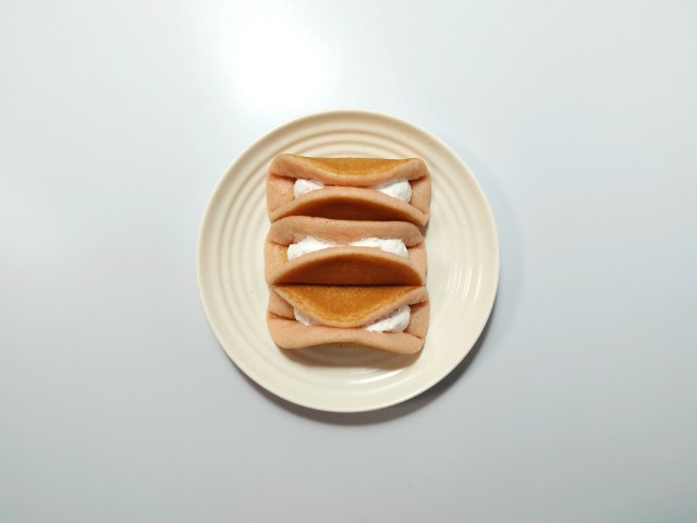 いちごペーストを練り込んだパンケーキ生地に、いちごのフリーズドライを混ぜたミルクホイップクリームをはさみ、オムレット形状に仕上げました。