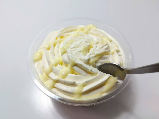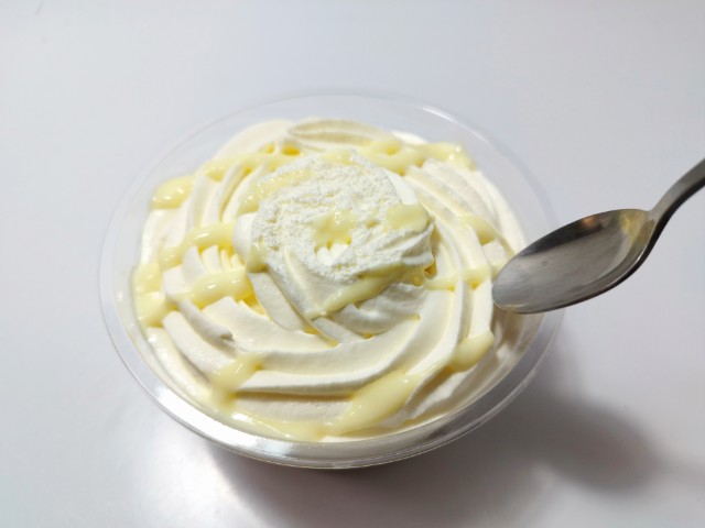 ホイップクリームがたっぷりのったミルクプリンです。セブンイレブンでは11月18日から「ドカ食いダイスキ! もちづきさん」コラボ第2弾を開催していて、今回の商品もその対象商品の一つとなっています。そんなクリームドカ盛り!背徳ミルクプリンですが、上から練乳ソースホイップクリームカラメルソースミルクプリンとなっていて、練乳ソースとろりとした食感濃厚な甘味ホイップクリームふんわりとした食感ミルクの風味があって、食べ応え抜群です。ミルクプリンなめらかな食感ミルクの味わいで、ホイップクリームともよく合います。ちなみにカラメルソース少量で、ホイップクリームミルクプリンの間の中央部分に入っていて、ほのかな苦味味のアクセントになっています。内容量は見ての通りのドカ盛りサイズなので、一人なら数回に分けて食べたり、シェアして食べるのにオススメです。ぜひクリームドカ盛り!背徳ミルクプリンを食べてみて下さい。
