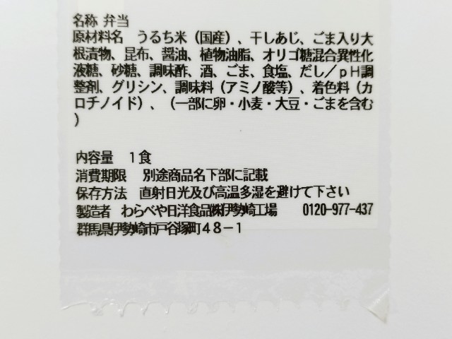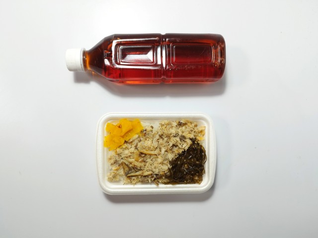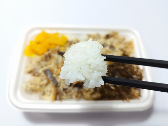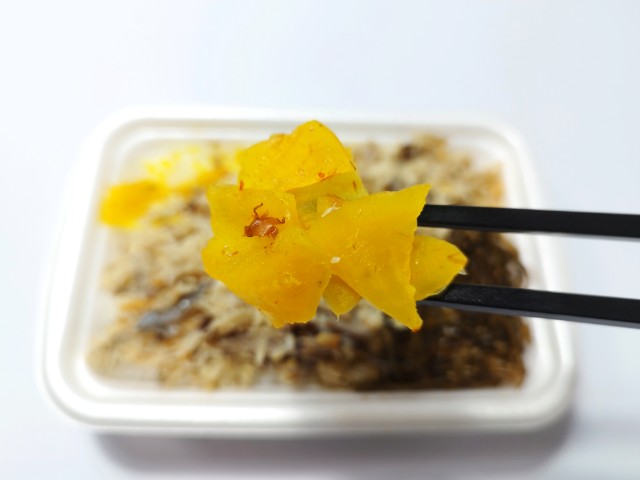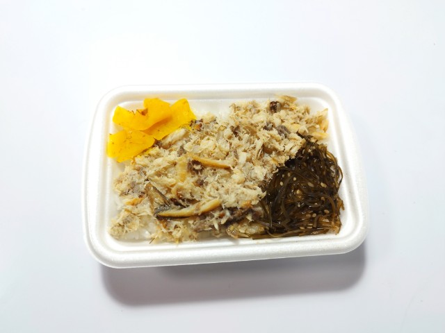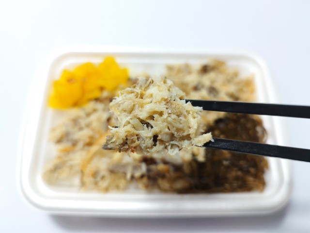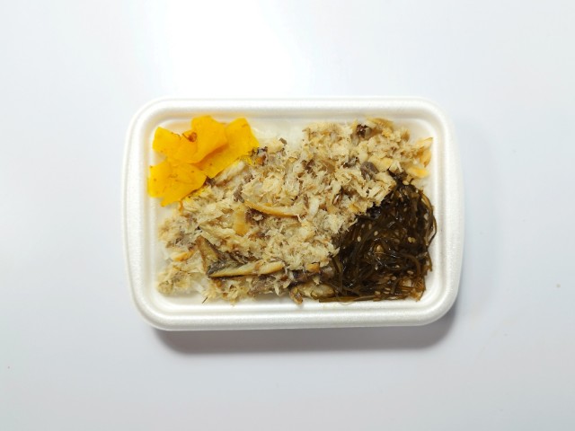 あじを使ったお弁当です。以前に塩麹で漬け込んだあじのほぐし身がのった塩麹仕立てのあじ御飯(2025年10月14日発売)がありましたが、今回は一夜干ししたあじのほぐし身になっています。そんな一夜干しあじの御飯ですが、あじのほぐし身はしっとりとした食感と鯵の旨味、ほどよい塩味があって、ご飯が進む一品になっています。あじのほぐし身以外にも昆布や大根漬けがのっていて、昆布の味わいや大根漬けの食感を楽しむ事が出来ます。正直、あじのほぐし身の美味しさに特化した商品といった感じで、それ以外はそこまで魅力はありませんが、鯵を堪能するにはオススメのお弁当だと思います。ミニ弁当なので内容量は多くありませんが、小腹が空いた時や軽く済ませたい時などにピッタリです。ぜひ一夜干しあじの御飯を食べてみて下さい。