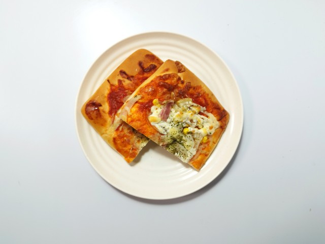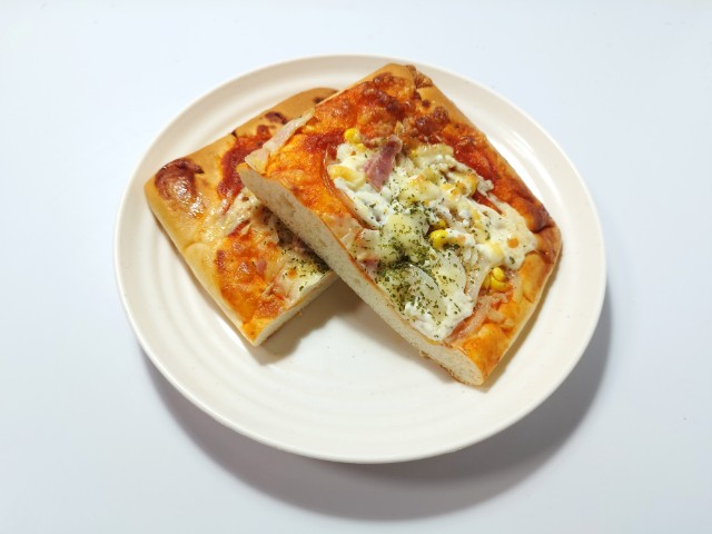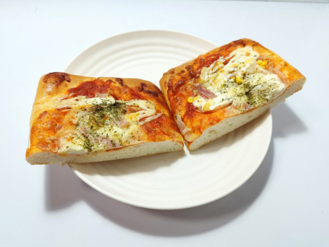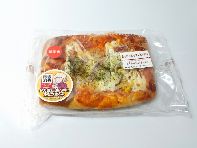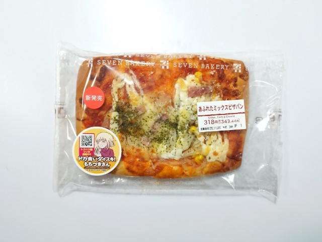 大きなピザパンです。セブンイレブンでは11月18日から「ドカ食いダイスキ! もちづきさん」コラボ第2弾を開催していて、今回の商品もその対象商品の一つとなっています。そんなあふれたミックスピザパンですが、生地はふんわりとした食感と歯切れの良さで、間違いのない美味しさです。味はトマトの酸味とマヨネーズのなめらかな味わいがあって、生地とのバランスも良いです。具材にはオニオンやコーン、ベーコン、チーズがのっていて、それぞれの味や食感を楽しめます。大きさは普通のピザパン2個分くらいなので、ガッツリ食べたい方にはピッタリだと思います。ぜひあふれたミックスピザパンを食べてみて下さい。