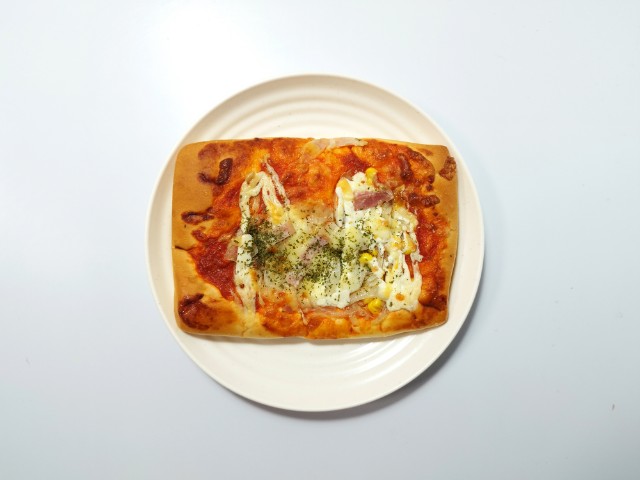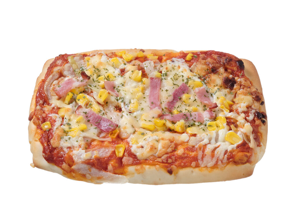 オニオン,コーン,ベーコン,チーズの4つの具材があふれたボリュームたっぷりのピザパンです。