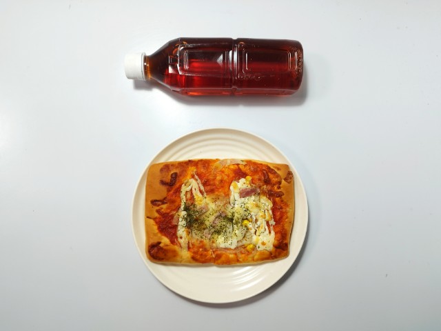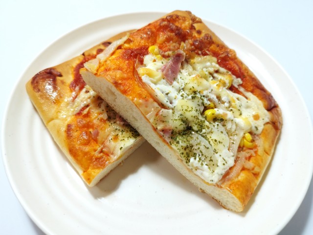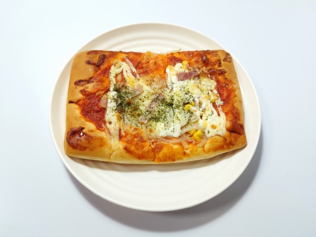 オニオンとコーン、ベーコン、チーズがトッピングされています。