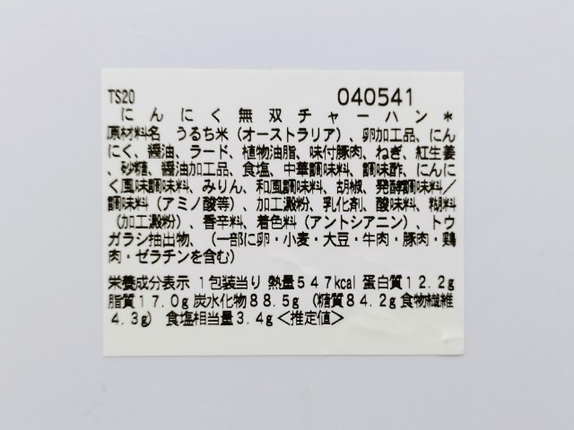 熱量:547kcal、たんぱく質:12.2g、脂質:17.0g、炭水化物:88.5g(糖質:84.2g、食物繊維:4.3g)、食塩相当量:3.4g