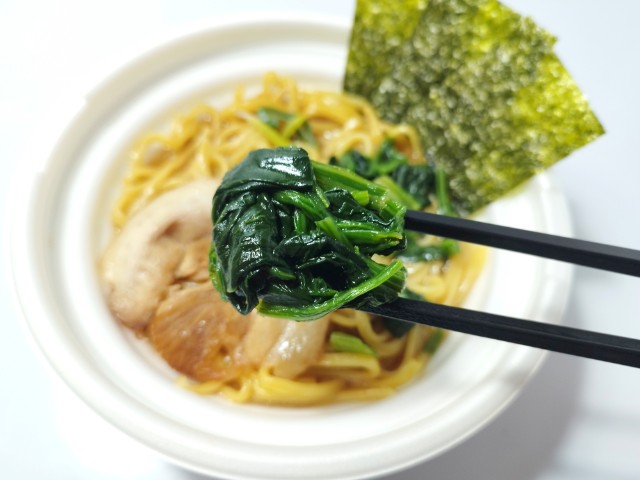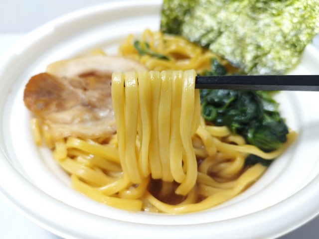 「中華蕎麦とみ田」監修の家系ラーメン。家系定番の厚みのある麺と、豚と鶏の旨みに醤油のキレが効いた豚骨醤油スープが特長です。