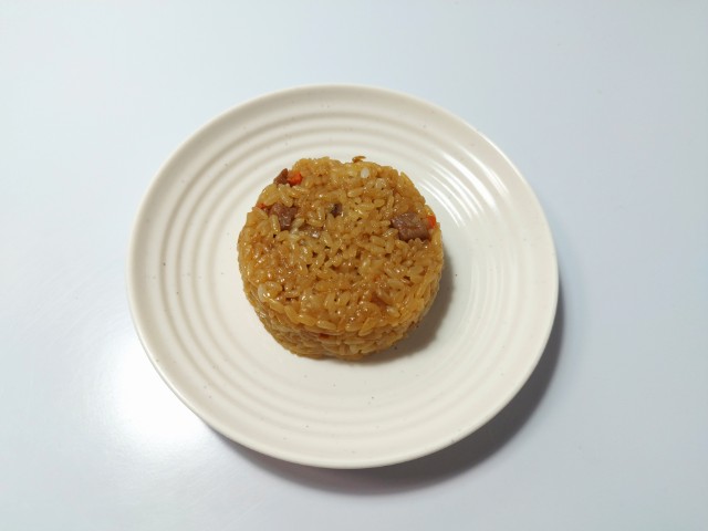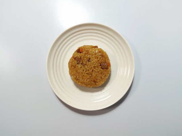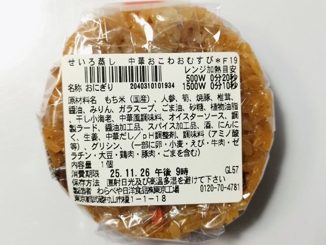 中華おこわおむすびです。せいろ蒸しのおこわおむすびだと、せいろ蒸し 舞茸おこわおむすび(2025年9月23日発売)やせいろ蒸し いか飯おこわおむすび(2025年8月5日発売)、せいろ蒸し 赤飯おこわおむすび(2025年4月29日発売)などがありますが、今回は中華おこわになっています。中華おこわおむすびですが、もち米のもちもちとした食感と醤油の味わい、オイスターソースの風味があって、食べ出すと止まらなくなる美味しさです。また、もち米には人参やたけのこ、焼豚などが混ぜ込まれていて、それぞれの味や食感を楽しめます。そのままでも十分美味しく食べられますが、パッケージの温めておいしいの言葉通り、温める事でもち米のモチモチ感や食材の味わいがアップするので、余裕があれば温めて食べる事をオススメします。大きさは普通のおむすびサイズで、小腹が空いた時や主食にあと一品追加したい時にピッタリです。ぜひ中華おこわおむすびを食べてみて下さい。