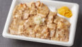 深谷ねぎと豚肉をラー油で炒め、ご飯に混ぜ込んだやみつき感のあるおむすびです。中具にも同じラー油仕立ての具材を入れ、食べ進みのよい仕立てです。