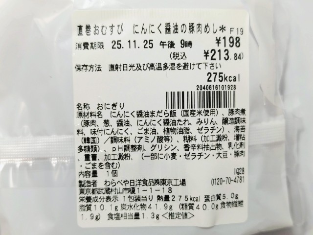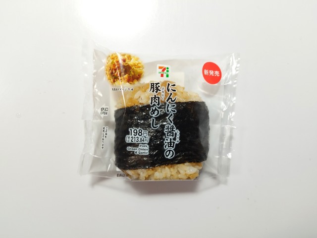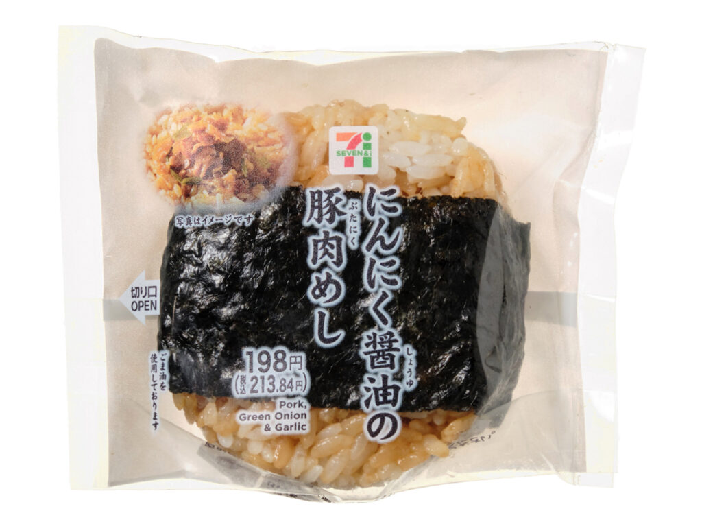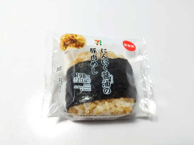 セブンイレブンの今週の新商品「直巻おむすび にんにく醤油の豚肉めし」を食べてみました。