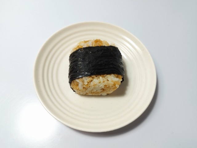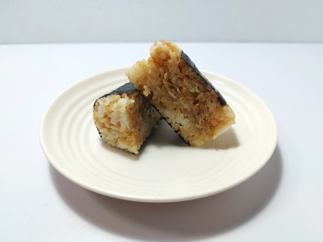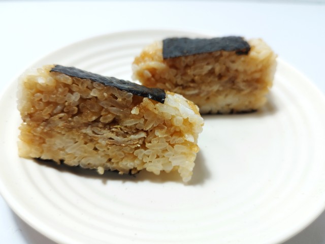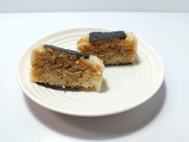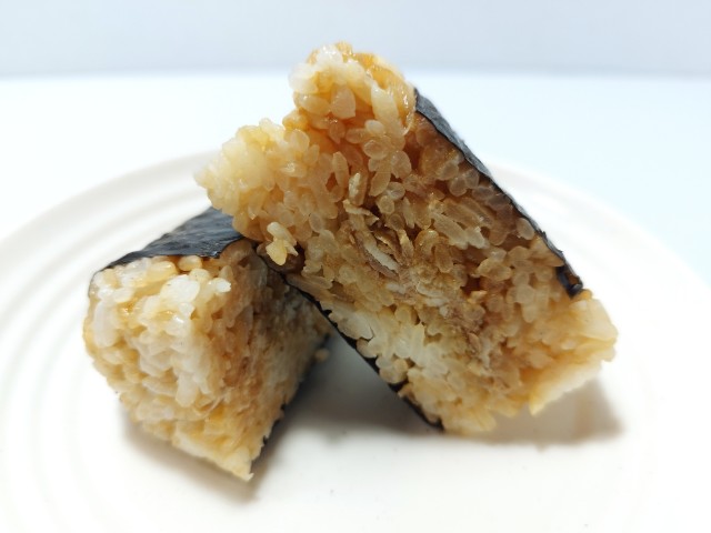 にんにく醤油たれで味付けされた豚肉やねぎを使ったおむすびです。商品名に惹かれて買ってしまった商品で、個人的には楽しみにしていた新商品の一つでもあります。そんなおむすびですが、ご飯はにんにく醤油たれで味付けがされていて、醤油の風味とにんにくの味わいがあって、これだけでも美味しく食べ進められます。中具の豚肉やねぎも同様ににんにく醤油たれが使われていて、豚の旨味とねぎの食感、ごま油の香りがあって、ご飯との相性抜群です。ご飯や中具ににんにく醤油たれが使われていますが、にんにくの強烈な感じはなく、かなり食べやすいおむすびになっていると思います。大きさは普通のおむすびサイズで、小腹が空いた時や主食にあと一品追加したい時にピッタリです。ぜひにんにく醤油の豚肉めしの直巻おむすびを食べてみて下さい。