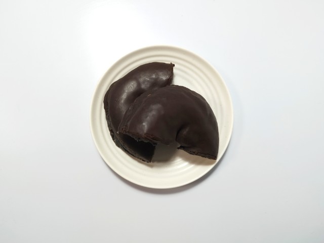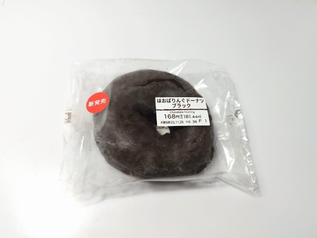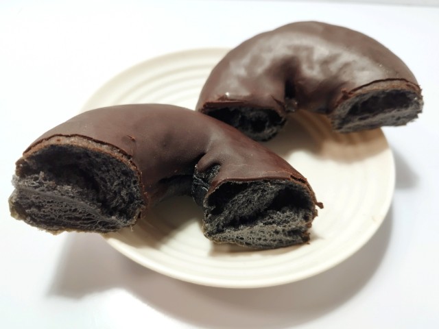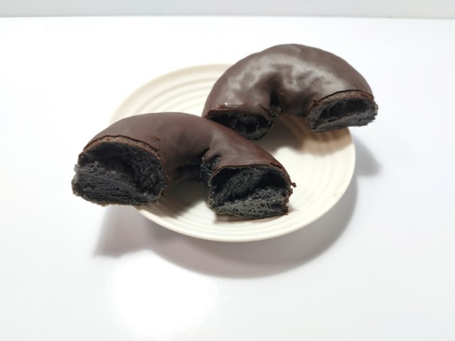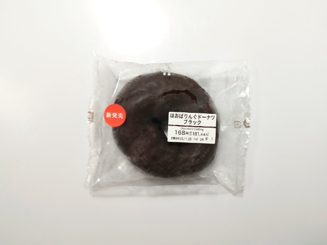 ほおばりんぐドーナツのブラックです。以前にほおばりんぐドーナツ(2025年10月28日発売)がありましたが、今回はチョコレートコーチングがされて、生地も真っ黒なドーナツになっています。そんなほおばりんぐドーナツですが、生地はふんわりとした食感とほのかな甘味で、安定の美味しさです。ちなみに生地は真っ黒ですが、無味無臭である炭末色素が使われているので、味や食感は普通の生地と何ら変わりはありません。その生地はチョコレートコーティングがされていて、しっとりとした食感とチョコの甘味があって、さらに美味しく食べ進められます。大きさは普通の菓子パンサイズで、おやつや小腹が空いた時にピッタリです。ぜひほおばりんぐドーナツのブラックを食べてみて下さい。