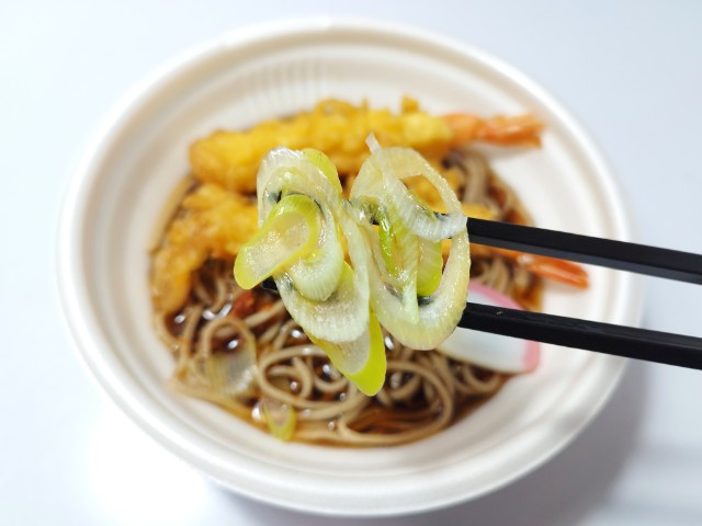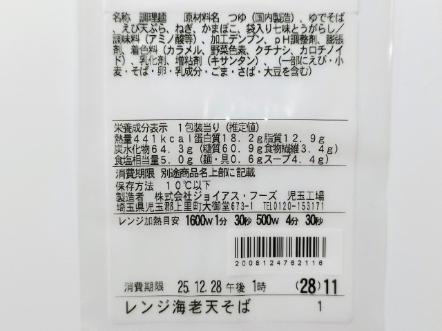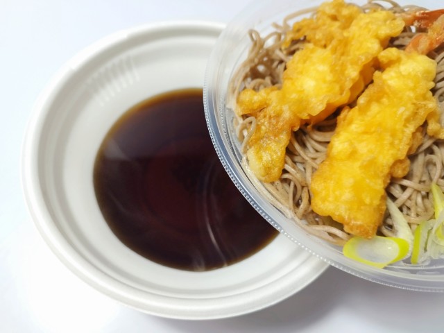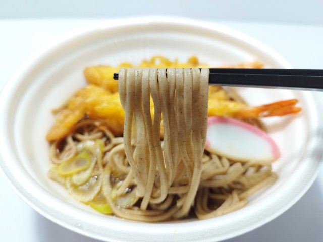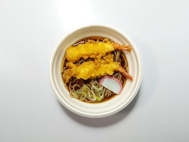 海老天がのったそばです。以前の購入が2024年12月27日発売だったので、約1年近く経っていますが、価格が599円(税込646円)から647円(税込698円)に商品名がだし香る海老天そばから冬の定番 海老天そばへと変わっています。そんな海老天そばですが、つゆはだしの旨味と濃厚な味わいで、間違いのない美味しさです。そばはそばの風味と歯切れの良さがあって、箸がどんどんと進みます。海老天はサクッとした衣の食感とプリっとした海老の食感で、そばとの相性抜群です。他にもねぎやかまぼこがのっていて、それぞれの味や食感を楽しめます。内容量は1食分にちょうどよく、お腹も満たされます。ぜひ海老天そばを食べてみてください。