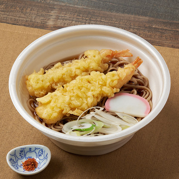 石臼挽き粉を使用した歯切れの良いそばにだしのきいたつゆを合わせ、海老天2本と、ねぎ・かまぼこをのせた温かいそばです。