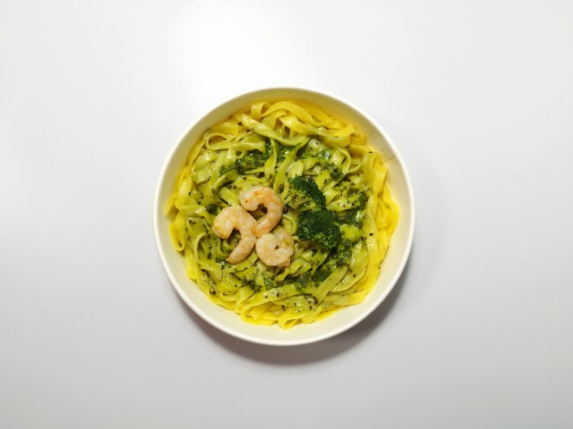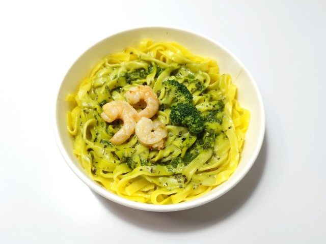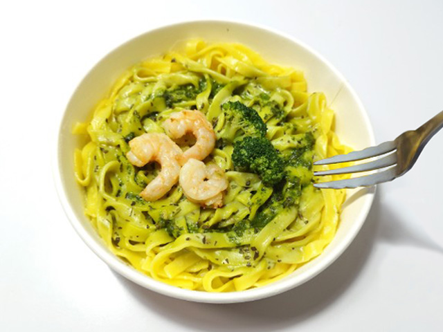 もちもちとした食感が楽しめる生パスタです。クリームのコクとバジルの爽やかな香りが感じられるソースに、海老とブロッコリーを盛り付けました。