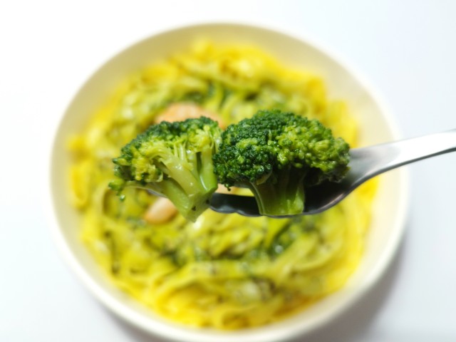 海老とバジルクリームを使った生パスタです。以前に生パスタ たらこクリーム 海老と大葉とシラス(2025年10月29日発売)や生パスタ ボロネーゼ(2025年10月7日発売)がありましたが、今回はバジルクリームソースを使った生パスタになっています。そんな生パスタですが、バジルクリームソースはバジルの風味とクリームのコク、なめらかな味わいがあって、ハマってしまう美味しさです。パスタは平打ち麺のフェットチーネが使われていて、もちもちとした食感と小麦の風味で、パスタソースとの相性抜群です。具材には海老やブロッコリーがのっていて、海老のプリプリとした食感やブロッコリーのホクホクとした食感を楽しむ事が出来ます。内容量は1食分にちょうどよく、お腹も満たされます。ぜひ海老とバジルクリームの生パスタを食べてみて下さい。