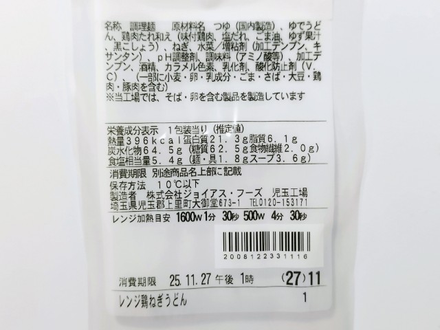 鶏肉とねぎ、水菜がのったうどんです。鶏肉とねぎを組み合わせた鶏ねぎうどんですが、個人的に鴨ねぎうどんと勘違いして買ってしまいました。そんな鶏ねぎうどんですが、つゆはだしの旨味とほどよい塩味で、安定の美味しさです。うどんはつるりとした食感とコシがあって、つゆとのバランスも良いです。具材の鶏肉は弾力のある肉質、ねぎは風味が良く、水菜はシャキシャキとした食感で、それぞれの味や食感を楽しむ事が出来ます。見た目以上にあっさりと食べられる美味しいうどんといった印象で、おむすびやお弁当にも合わせやすいと思います。内容量は1食分にちょうどよく、お腹も満たされます。ぜひ鶏ねぎうどんを食べてみて下さい。