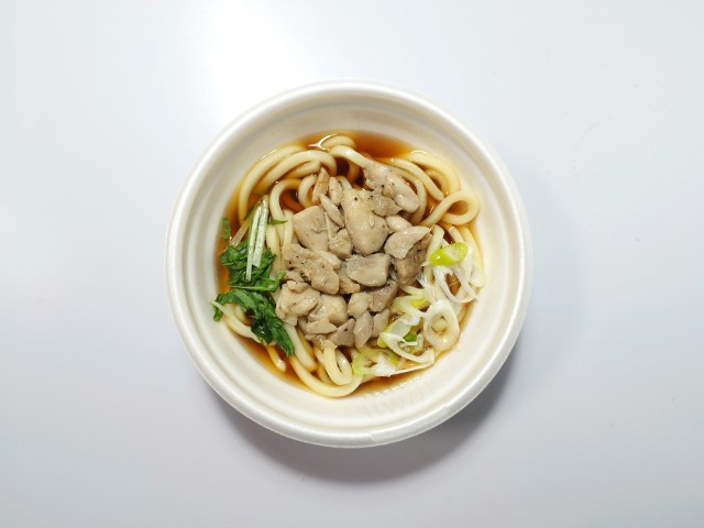 コシのあるうどんに、だしのきいたつゆを合わせて、鶏肉とねぎ、水菜をのせたあっさりと食べられる温かいうどんです。※宮崎県、鹿児島県では取り扱いがございません。