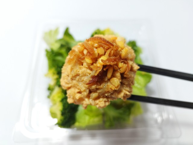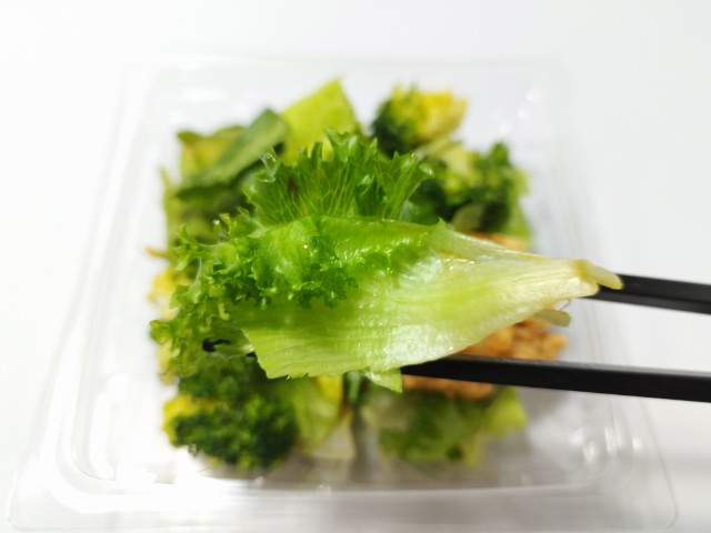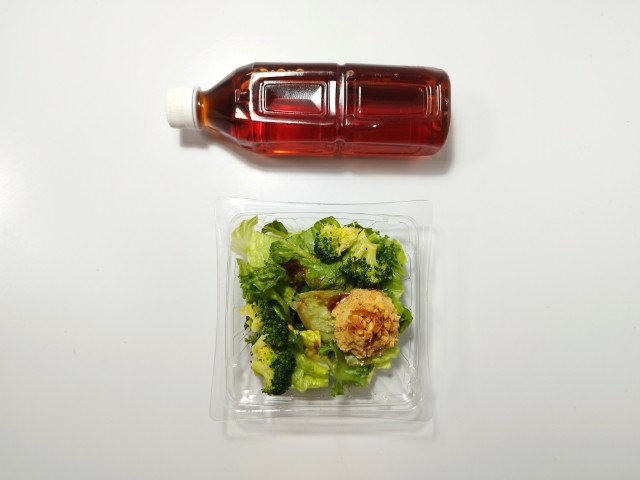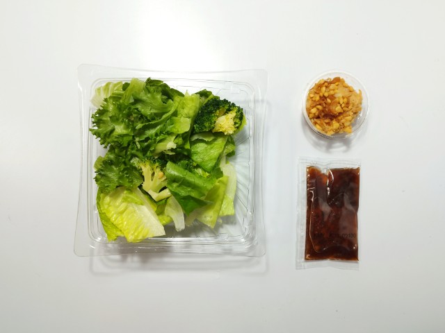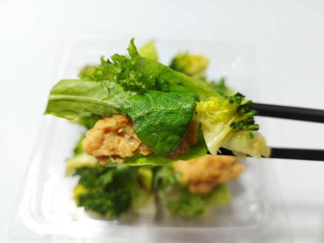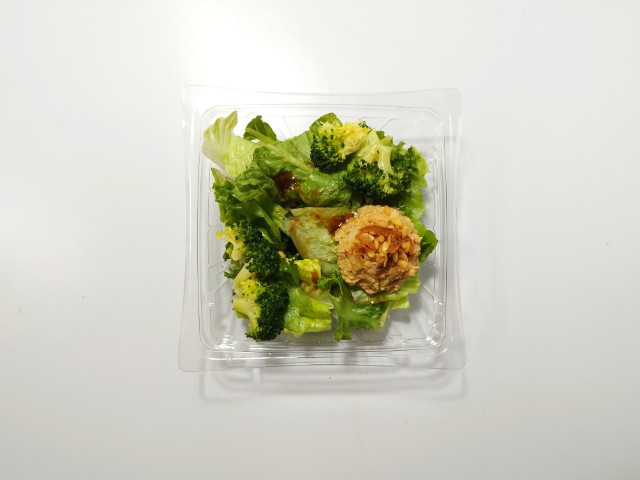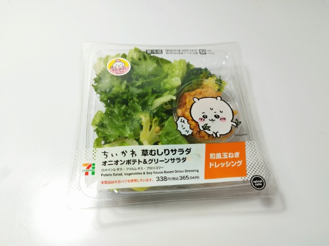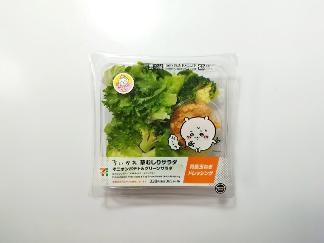 草むしりサラダです。セブンイレブンでは昨年の「セブンイレブン×ちいかわ あったまるね、きもち」キャンペーン(2024年12月3日~25日)に続き、今年も「ちいかわと冬をたのしんじゃお!」キャンペーンを12月2日より開催していて、今回の商品もその対象商品の一つとなっています。そんな草むしりサラダですが、ブロッコリーとロメインレタス、リーフレタスといった3種類の野菜とオニオンポテトが入っていて、それぞれの味や食感を楽しむ事が出来ます。特にオニオンポテトは玉ねぎの風味とじゃがいもの味わい、りんごのほのかな酸味があって、単体でもサラダと合わせても美味しく食べられます。和風玉ねぎドレッシングは醤油の風味と玉ねぎの甘味、さっぱりとした味わいで、こちらもサラダによく合います。内容量は一人分にちょうどよく、朝食や主食にあと一品追加したい時にピッタリです。ぜひ草むしりサラダを食べてみて下さい。