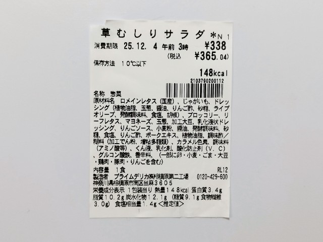 熱量:148kcal、たんぱく質:3.4g、脂質:10.2g、炭水化物:12.1g(糖質:9.1g、食物繊維:3.0g)、食塩相当量:1.4g
