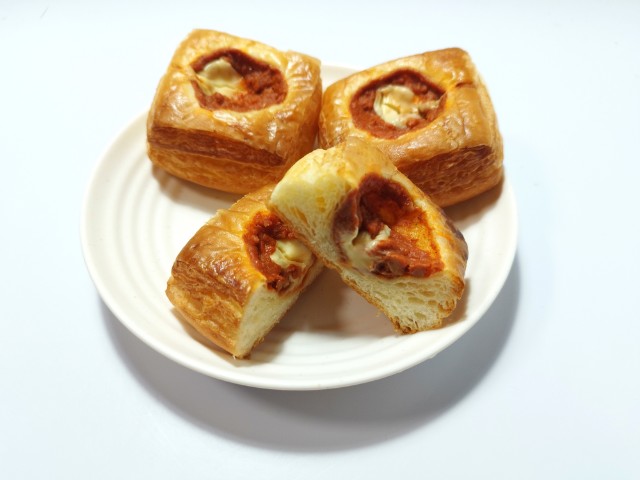 ミートフィリングとチーズソースがのった惣菜パンです。シンプルな見た目に惹かれて買ってみました。そんなミート&チーズデニッシュですが、生地はしっとりとした食感と小麦の風味で、安定の美味しさです。トッピングのミートフィリングはトマトの酸味と肉の味わいがあって、生地とのバランスも良いです。チーズソースが一緒にのっている事で、味のアクセントになっているのもポイント高いです。3個入ですが、1個はふた口サイズくらいなので、一人でも普通に食べ切れます。もちろんシェアするにもピッタリです。ぜひミート&チーズデニッシュを食べてみて下さい。