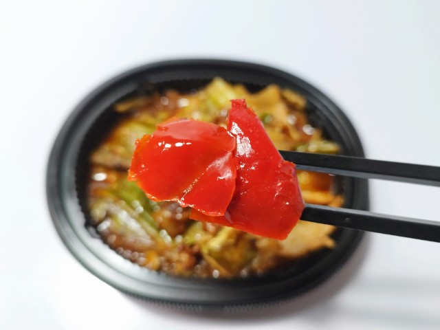 ホイコーローです。見た目の良さと商品名に惹かれて買ってみました。そんなホイコーローですが、醤の旨味と味噌のコク、香味油の風味があって、間違いのない美味しさです。ホイコーローの具材でもある豚肉は豚の旨味とジューシーな味わい、キャベツはシャキシャキとした食感としんなりとした食感を楽しめます。他にも赤ピーマンや玉ねぎも入っているので、最後のひと口まで飽きることなく食べられます。濃厚な味わいのホイコーローなので、食べた後の満足度も高いと思います。内容量は一人分にちょうどよく、おつまみやご飯のおかずにあと一品追加したい時にピッタリです。ぜひホイコーローを食べてみて下さい。